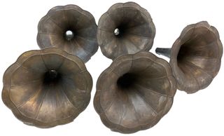 Lote de cinco trompetas de gramófonos. Precio por unidad. Hay cinco unidades disponibles. Medidas: 38 cm de alto y 43 cm de largo.