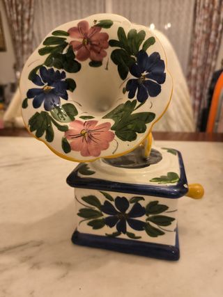 Precioso gramófono de cerámica de Talavera. Ideal para decoración. Es una pieza única, pequeña y detallada. - Fabricado en cerámica. - Pintado a mano con motivos florales. - Se encuentra en buen estado, con ligeras señales de uso. - Perfecto para coleccionistas o amantes de la decoración vintage.