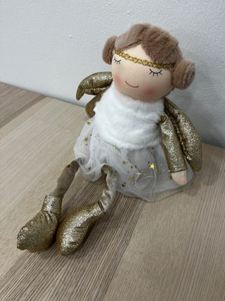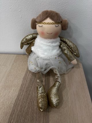Figura decorativa de un ángel con trompeta, con un acabado dorado que le da un toque clásico. - Diseño detallado de un querubín. - Base texturizada que simula roca. - Acabado metálico dorado.