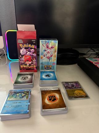 Se vende lote variado de cartas Pokémon de diferentes colecciones. Incluye cartas de energía y Pokémon. - Cartas de energía (agua, lucha, metal). - Carta Pokémon Vaporeon (Coreano). - Carta Pokémon Mewtwo (Coreano). - Carta Pokémon Lycanroc (Coreano).