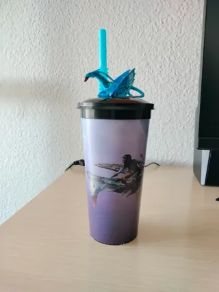 Vaso temático de Avatar Fuego y Ceniza. - Diseño inspirado en la película. - Incluye figura decorativa de banshee. - Pajita azul. - Tapa negra.