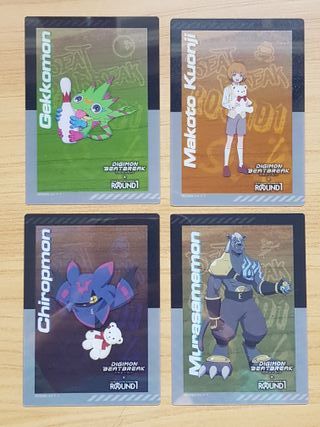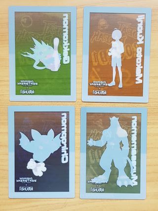 Vendo lote compuesto por 4 cartas translucidas oficiales de Gekkomon, Makoto Kuonji, Chiropmon y Murasamemon, personajes del anime Digimon Beatbreak. Producto promocional exclusivo del evento celebrado en los establecimientos Round1 de Japón, durante un breve periodo de tiempo. Nuevas a estrenar, sin uso. Precio por el lote, no se venden por separado. Artículo de coleccionismo original de importación, procedente de Japón, difícil de conseguir. Ideal para coleccionistas y fans de la serie. Tengo más productos de Digimon en mi perfil. Realizo envíos. Acepto pago por Wallapop y Paypal. Ofrezco descuentos al comprar lotes.