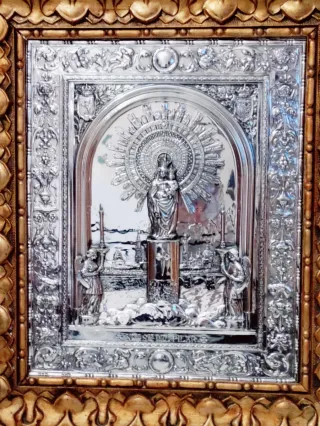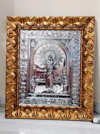Precioso cuadro con la imagen de la Virgen del Pilar. - Marco dorado con detalles. - Relieve plateado de la Virgen. - Diseño detallado y ornamental. - Mide 50 x 60 cm.