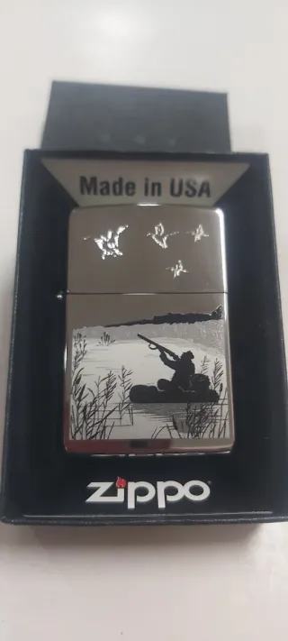 Mechero Zippo completamente nuevo a estrenar con diseño de cazador Fabricado en EE. UU. - Grabado de patos volando en la tapa. - Escena de caza en un lago con junco en la parte inferior. - Acabado metálico plateado.
