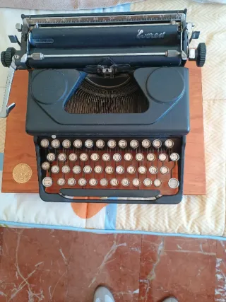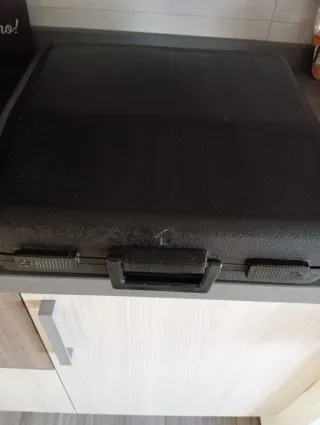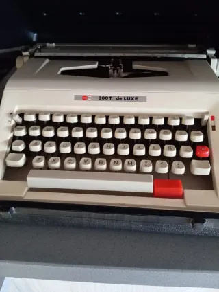 Máquina de escribir clásica en su maletín. - Maletín de transporte negro. - Asa para facilitar el transporte. - Cierres de seguridad.