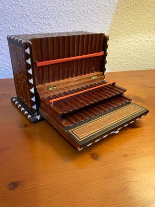 Elegante tabaquera de madera con incrustaciones de taracea. - Diseño artesanal con detalles geométricos. - Acabado en madera oscura. - Compartimentos interiores para organizar. - Bisagras doradas.