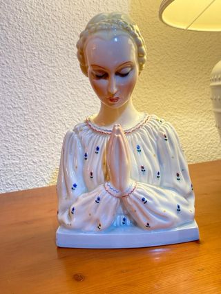 Preciosa figura de porcelana italiana de una mujer en actitud de oración. Fabricada en Lucca. Tiene un pequeño desconchón apenas visible (hay foto).