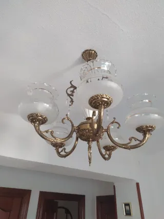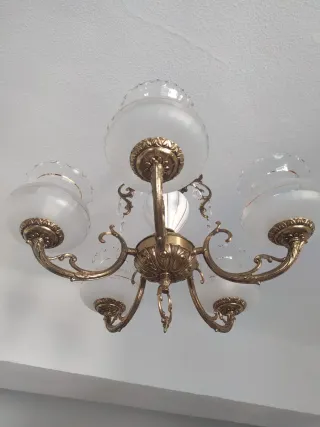 Elegante lámpara de techo de estilo antiguo, con un acabado dorado que aporta un toque clásico a cualquier estancia. - Diseño de cinco brazos. - Tulipas de cristal esmerilado y detalles dorados. - Colgante de cristal decorativo.