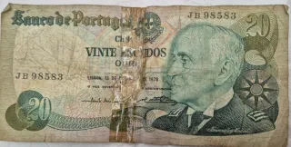 Billete de 20 Escudos de Portugal, emitido en 1978. - Serie JB 98583. - Firma del Vice Gobernador y Administrador. - Diseño con retrato y motivo náutico.