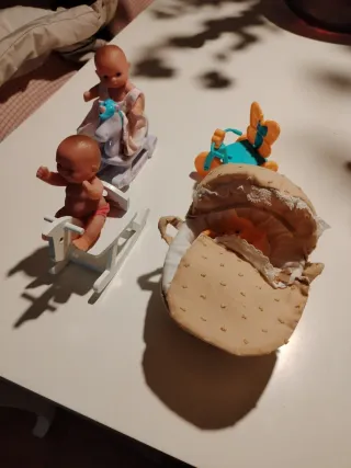 Conjunto de muñecas Barriguitas con varios accesorios. - Incluye tres muñecas. - Carro de bebé. - Caballito balancín y triciclo