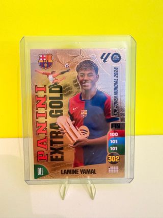 Carta Panini Extra Gold de Lamine Yamal, edición Top Joven Mundial 2024. - Diseño especial Extra Gold. - Incluye estadísticas del jugador. - Producto de colección.