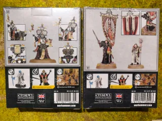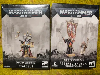 Dos cajas de miniaturas de Warhammer 40,000 de la facción Adepta Sororitas. - Caja 1: Adepta Sororitas Dialogus (1 miniatura). - Caja 2: Adepta Sororitas Aestred Thurga, Reliqant at Arms (2 miniaturas).