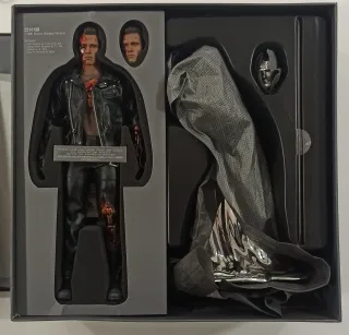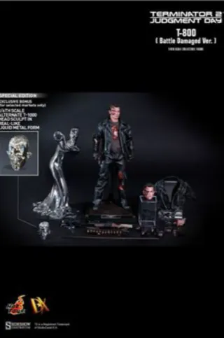 Figura coleccionable de Hot Toys DX13, T-800 Battle Damaged Special Edition. - Incluye escultura de cabeza T-1000 alternativa en forma de metal líquido. - Escala 1/6. - No incluye cinturón. Expuesta en habitación sin humos.