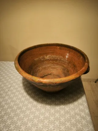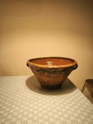 Lebrillo antiguo de barro con asas. - Material: Barro. - Color: Tonos tierra y oscuros. - Diseño: Forma cónica con dos asas laterales.