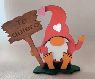 Bonito gnomo de madera ideal para demostrar a tu pareja que la quieres por San Valentín. Cortada a laser y con unas medidas de 15 cmde altura, 18 cm de ancho y 5 cm de base. Se puede personalizar en el mensaje y el color.