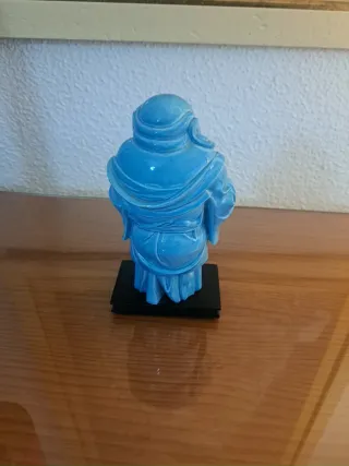 Figura decorativa de Buda sonriente. - Material: Porcelana vidriada. - Color: Azul. - Base negra incluida.