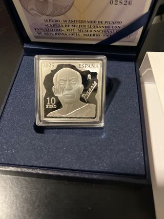 Moneda de plata con acabado Proof, conmemorativa del 50 aniversario de Picasso. - Diseño basado en la obra Cabeza de mujer llorando con pañuelo (III), 1937. - Incluye certificado de autenticidad. - Edición 2023.