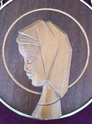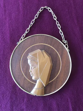 Figura religiosa de la Virgen María, con un rostro bellamente tallado en madera. Diámetro de 21 cm con cadena alto 33cm - Material: Madera - Diseño: Rostro de la Virgen - Colgante con cadena