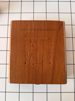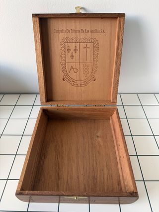 Elegante caja de puros de madera (vacía) de la Compañía de Tabacos de Las Antillas, S.A. con su escudo grabado a fuego tanto en el exterior como en su interior. Sello de autenticidad. 25 1866 No:1. En perfecto estado. Medidas: 17x19x3,5