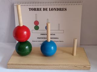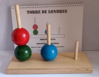 Equipo para el Test de la Torre de Londres (ToL), protocolo Neuronorma, test de psicomotricidad de apilamiento de 3 bolas, dirigida a sujetos a partir de los 6 años. Es una prueba de funciones ejecutivas, en concreto planificación. Tamaño reglamentario, ancho: 21 cm, fondo: 8 cm, alto: 15 cm El test de la Torre de Londres consta de 12 retos, cuya dificultad va aumentando pues el número de movimientos para llegar a la meta aumenta de 2 a 6. Con instrucciones y fichas de trabajo encuadernadas. Bolas de haya de 45 mm de diámetro. Si encuentras este anuncio ya reservado, no te preocupes, entra en el chat, siempre tengo varios ejemplares