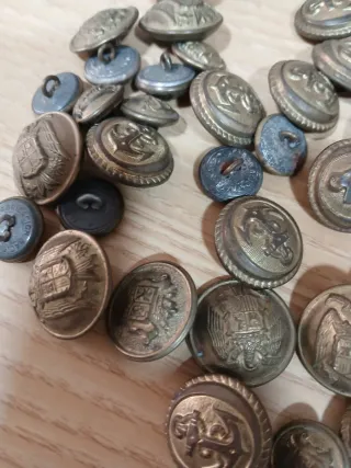 Conjunto de botones de estilo militar, con diversos diseños y acabados. - Botones de metal con grabados. - Diseños variados, algunos con anclas y escudos. - Tonos plateados y dorados.