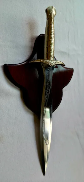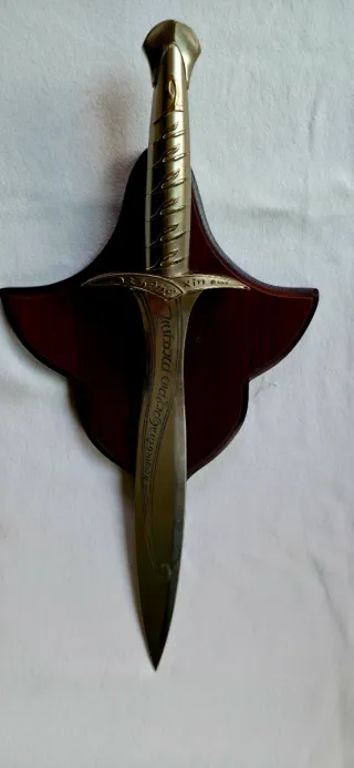 Réplica de la espada Sting, también conocida como Dardo, inspirada en la saga. - Dimensiones réplica: 47 x 12 cm. - Soporte Mural Incluido: Se entrega con su placa de madera original con diseño de ala, lista para colgar en la pared y exhibir. - Dimensiones mural: 27 x 22 cm. La hoja mantiene el grabado élfico original en perfectas condiciones. El mango presenta desgaste. Adquirido en una forja medieval hace 15 años.
