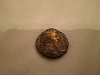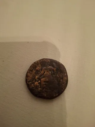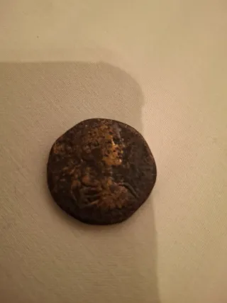 Moneda antigua de origen romano. Presenta un diseño detallado en su anverso. - Material: Bronce o cobre. - Diseño: Figura histórica o mitológica.