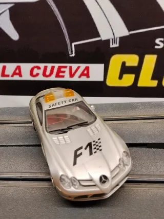 Coche de Scalextric Mercedes Benz, modelo Safety Car de Fórmula 1. Diseño plateado con detalles en negro. - Luces naranjas en el techo., delanteras y traseras que se encienden como cohe de seguridad en la formula 1 - Inscripción SAFETY CAR en el techo. - Logo F1 con bandera a cuadros en el capó. Entrega en mano o añadiendo los portes para envío por correos a cualquier parte de España . Para más información enviar wazap a mi número 680114909