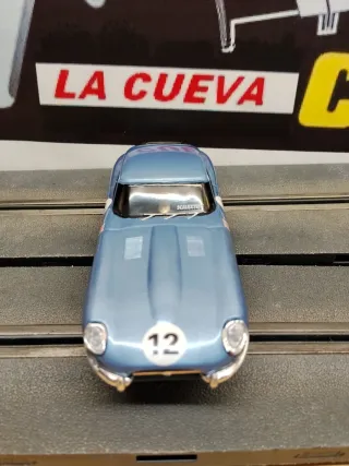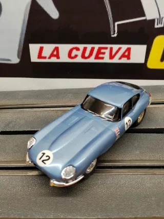 Coche de slot Jaguar E-Type de Scalextric en color azul. - Réplica detallada del clásico deportivo. - Decorado con el número 12 y bandera británica. - Ideal para coleccionistas y aficionados a las carreras. ,funciona perfectamente . Entrega en mano o añadiendo los portes para envío por correos a toda España .Para más información enviar wazap a mi número 680114909