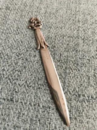 Elegante abrecartas de plata con un delicado diseño floral en la parte superior y la figura de sant Jordi (san Jorge). - Material: Plata. - Diseño: Detalle floral en el mango. - Longitud: 10 cm.