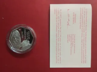 Moneda de plata conmemorativa del fin del milenio. - Paz, Imprenta, Subida a la luna - Valor: 1.500 pesetas. Cada una. - Composición: Plata 925 milésimas. - Peso: 20 gramos. - Tirada máxima: 30.000 unidades. - Canto: Liso. - Calidad: Proof.