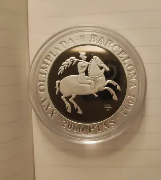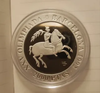 Moneda conmemorativa de las Olimpiadas de Barcelona 1992. - Diseño de jinete a caballo. - Inscripción OLIMPIADA BARCELONA 1992. - Valor 2000 PTAS y XXV JUEGOS OLIMPICOS. - Símbolo olímpico y escudo de España.