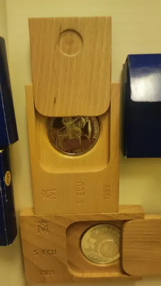 Moneda de 5 ECU del año 1989, presentada en una caja de madera. Moneda con contenido en plata de 1 Oz. Leer certificado - Diseño con jinete. - Grabado IMPERATOR y 1989. - Caja de madera con tapa y certificado. - Sello M y 5 ECU en la caja.