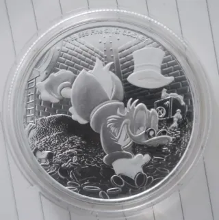 Moneda conmemorativa de Tío Gilito, de 1 Oz de plata 999. - Fabricada en plata fina 999. - Diseño detallado con Tío Gilito rodeado de monedas y su sombrero. - Presentada en su cápsula protectora.