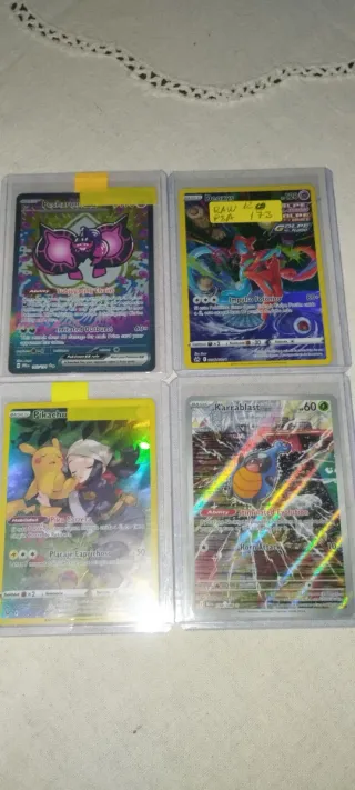 Conjunto de cartas coleccionables de Pokémon. - Carta Pikachu con arte especial. - Carta Karrablast con arte brillante. - Carta Poder con arte especial. - Carta Deoxys RAW 12 PSA 173.