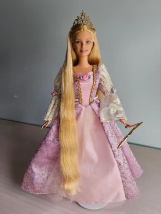 Muñeca Barbie princesa Rapunzel de la pelicula Barbie Rapunzel del año 2002. En muy buen estado, con el pelo brillante y suave. El vestido está impecable. Está como nueva. Aunque una de sus manos está dañada. Incluye su máscara y zapatos. La cuerda de la espalda para recoger su pelo funciona perfectamente. Tal y como se ve en las fotos. La peana no se vende. Barbie Fantasy Tales