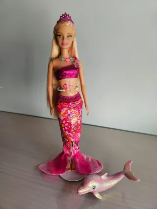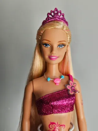 Muñeca Barbie sirena de la película Barbie en una aventura de sirenas o barbie in a mermaid tale, del año 2010. Incluye su delfín rosa. La cola se convierte en una sudadera con capucha. Con el agua fría le salen mechas rosas y un tatuaje en el torso y brazo. Tiene el pelo suave e impecable, como nueva. Tal y como se ve en las fotos. La peana no se vende.