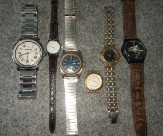 Lote de seis relojes de diferentes estilos y marcas. Duward, Seiko, Swatch..Se venden como piezas o a restaurar, alguno solo le falta poner pila ( batería ) Se vende el lote completo, no se venden relojes sueltos de este lote. 40€ con el empaquetado y envío incluido, envío por correo certificado, pago mediante transferencia o bizum, preferiría venta en persona..!! NO HAGO ENVÍOS POR LA APP..!! NO TENGO MONEDERO NI CUENTA EN LA APP..!! Pregunta sin compromiso..!!