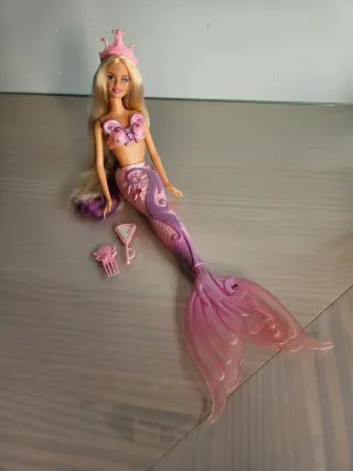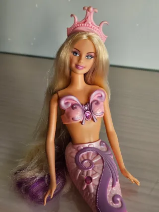 Muñeca Barbie sirena de la colección Barbie Fairytopia del año 2003. Tiene el pelo impecable. Las cola está perfecta, no tiene ningún roto. Incluye su espejo y su peineta. Está como nueva. Las fotos sirven de descripción. Barbie Magical Mermaid