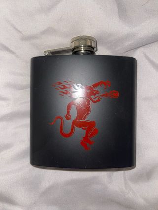Petaca negra con diseño de demonio en llamas, inspirada en Fireball Cinnamon Whisky. - Diseño llamativo y único. - Acabado mate.