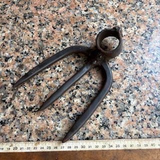 Herramienta de metal antigua, ideal para trabajos de jardinería. - Diseño con tres puntas. - Mango con orificio para fijación. No leer: forjada en fragua de carbón,herrero,tonelería,carpintería,carpintero,herramienta de talla gubia,abarqueiro,tonelería,tonelero,campo,siega,jardín,labranza,talar,rustico,huerto,huerta,minero,mina,cantero,picapedrero,bushcraft,hojalatero hojalateria rural pueblo