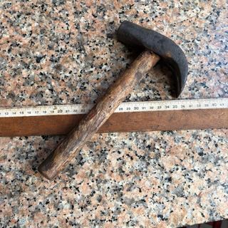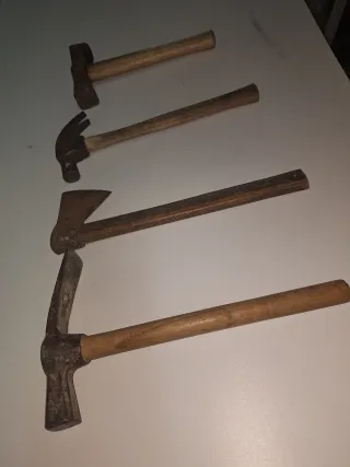 Conjunto de herramientas antiguas, ideales para trabajos de albañilería y carpintería. - Martillo de albañil. - Martillo de carpintero. - Hacha. - Maza o piqueta.