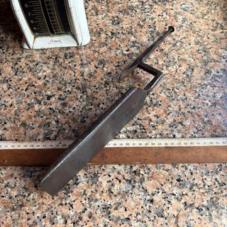 Herramienta antigua de metal, con un diseño robusto y peculiar. - Material: Metal. - Color: Oscuro. No leer: forjada en fragua de carbón,herrero,tonelería,carpintería,carpintero,herramienta de talla gubia,abarqueiro,tonelería,tonelero,campo,siega,jardín,labranza,talar,rustico,huerto,huerta,minero,mina,cantero,picapedrero,bushcraft,hojalatero hojalateria rural pueblo