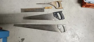 Conjunto de tres serruchos, herramientas manuales para carpintería. - Serrucho con mango de madera y hoja dentada. - Serrucho de mano con mango de madera. - Serrucho de gran tamaño con mango negro. 15 € cada uno