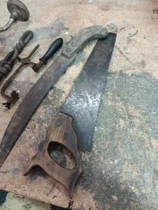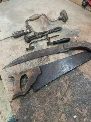 Conjunto de herramientas antiguas de carpintería, ideales para coleccionistas o proyectos de restauración. - Sierra de mano. - Serrucho. - Cepillo de alambre. - Taladro manual. - Escuadra de carpintero. - Formón. - Lima. - Broca. - Alicates pequeños.