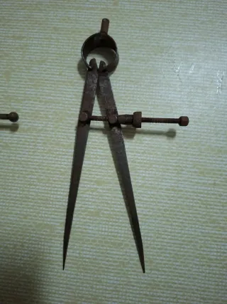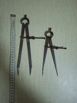 Conjunto de dos compases antiguos de dibujo, ideales para coleccionistas o para uso en trabajos de precisión. - Fabricados en metal. - Mecanismo de ajuste con tornillo.