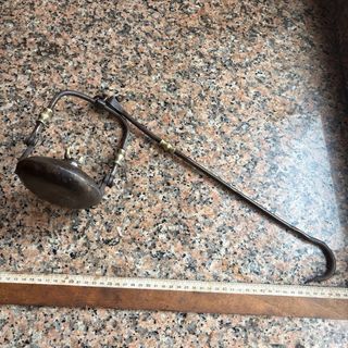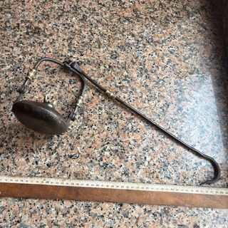 Antigua lámpara de aceite de metal con un diseño único y un gancho para colgar. - Cuerpo ovalado de metal. - Brazo curvo con remates dorados. - Gancho en el extremo para sujeción. No leer: forjada en fragua de carbón,herrero,tonelería,carpintería,carpintero,herramienta de talla gubia,abarqueiro,tonelería,tonelero,campo,siega,jardín,labranza,talar,rustico,huerto,huerta,minero,mina,cantero,picapedrero,bushcraft,hojalatero hojalateria rural pueblo