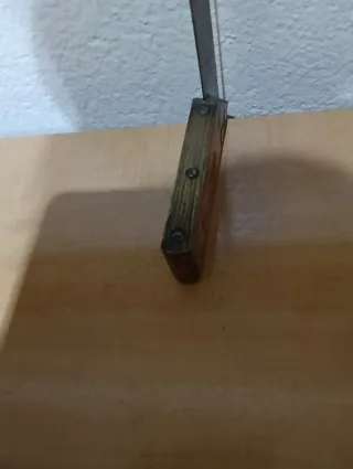 Herramienta de medición clásica para trabajos de carpintería. - Base de madera. - Hoja de metal. - Remaches visibles.
