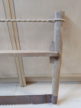 Se vende sierra o serrucho de bastidor o armazón. De madera y metal que se tensa mediante una cuerda. Herramienta de carpintería. Es una pieza rústica con la sierra dentada oxidada pero la madera en buenas condiciones sin rastros de polilla. La cuerda es moderna de plástico.
