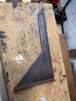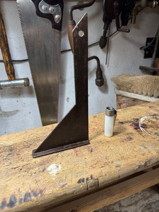 Preciosa falsa escuadra antigua de madera y metal. Ideal para carpintería. - Fabricada con madera oscura y robusta. - Metal con señales de uso, que le dan un toque vintage. - Perfecta para trabajos de precisión.